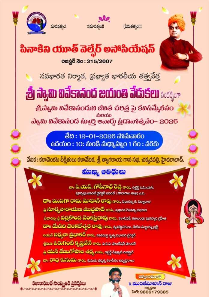✍🏻భారతీయ యువతను అద్భుతంగా ప్రభావితం చేసిన స్వామి వివేకానందను ఆదర్శంగా తీసుకోవాలని మాజీ ఐ.పి.ఎస్. అధికారి డాక్టర్ సి.ఎన్.గోపినాధ్ రెడ్డి పేర్కొన్నారు. పినాకిని యూత్ వెల్ఫేర్ అసోసియేషన్ ఆధ్వర్యంలో సోమవారం ఉదయం హైదరాబాద్ శ్రీత్యాగరాయ గానసభ లోని కళా వెంకట దీక్షితులు కళావేదిక నందు శ్రీస్వామి వివేకానంద జయంతి సందర్భంగా స్వామి వివేకానంద జీవితచరిత్ర పై కవిసమ్మేళనం మరియు అవార్డు ప్రదానోత్సవం ఘనంగా జరిగింది.