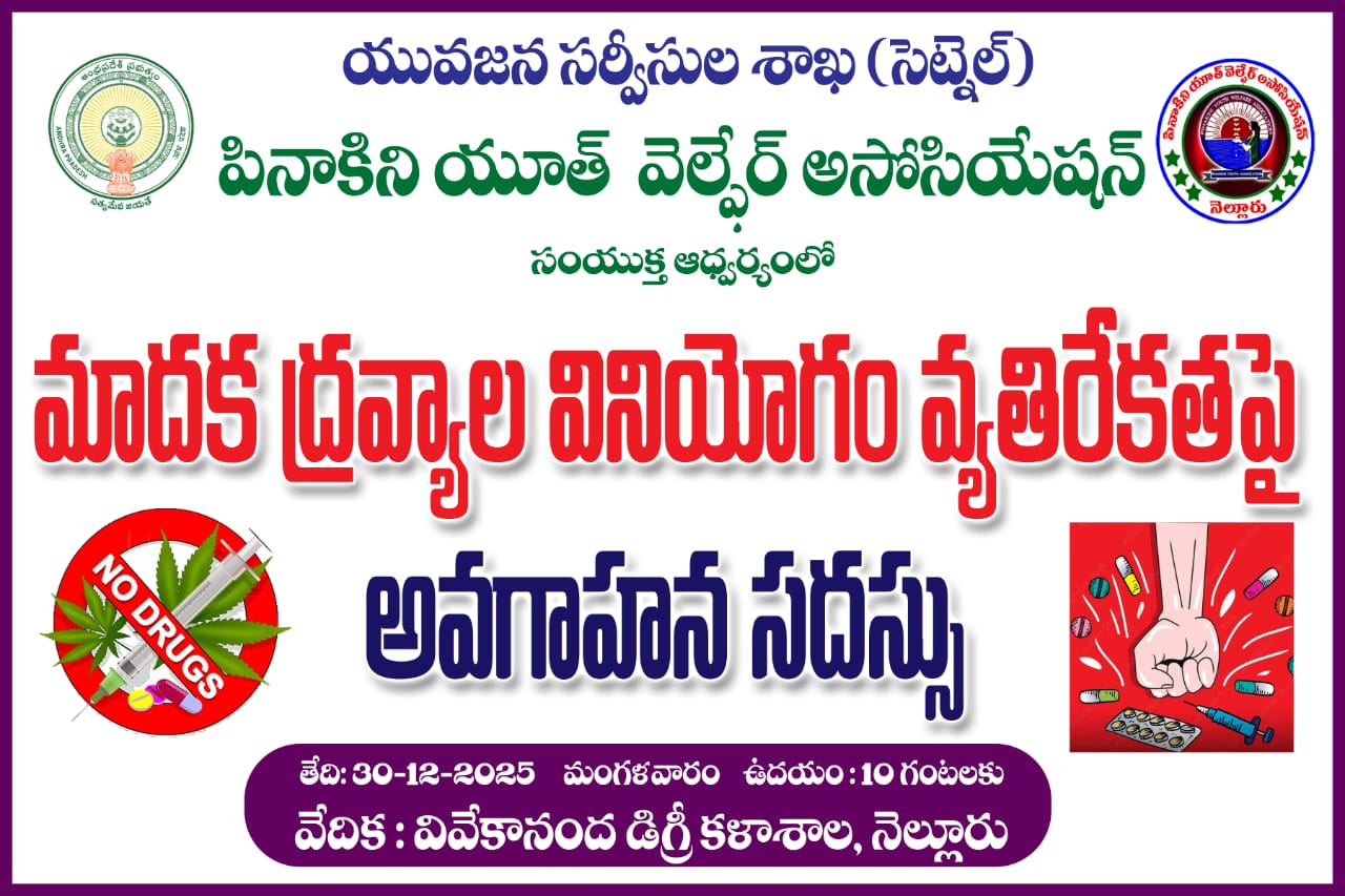 ✍🏻ప్రస్థుతం దేశాన్ని పట్టి పీడుస్తున్న సమస్యల్లో మాదకద్రవ్యాలు అనేది ముఖ్యమైన సమస్యగా మారిందని యువజన సర్వీసుల శాఖ ముఖ్యకార్య నిర్వహణాధికారి ఎ.నాగేశ్వరరావు పేర్కొన్నారు. యువజన సర్వీసుల శాఖ (సెట్నెల్) మరియు పినాకిని యూత్ వెల్ఫేర్ అసోసియేషన్ సంయుక్త ఆధ్వర్యంలో మంగళవారం ఉదయం నెల్లూరు టౌనుహౌస్ పేట లోని వివేకానంద డిగ్రీ కళాశాల నందు “మాదక ద్రవ్యాల వినియోగం వ్యతిరేకతపై అవగాహన సదస్సు” జరిగింది. ఈసందర్భంగా సర్కిల్ ఇన్స్పెక్టర్ ఎన్.రామారావు మాట్లాడుతూ ఎంతో మంది విద్యార్థులు, యువత మాదకద్రవ్యాల బారిన పడి జీవితాన్ని బుగ్గి పాలు చేసుకుంటున్నారు.